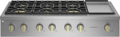 Monogram Statement Series ZGU486NDTSS 48 Inch Slide-In Professional Gas Rangetop with 6 Sealed Burners, Continuous Grates, Griddle, Stainless Steel Griddle Cover, Custom Color LED Accent Lighting, Reversible Wok Grates, WiFi Compatible, CSA and ADA Compliant Sabbath Mode: No Number of Burners: 6 Style: Sealed Burner Type: Rangetop Control Type: Knobs Downdraft Venting: No Actual Width: 47 7/8 Inch WiFi: No Continuous Grates: Yes